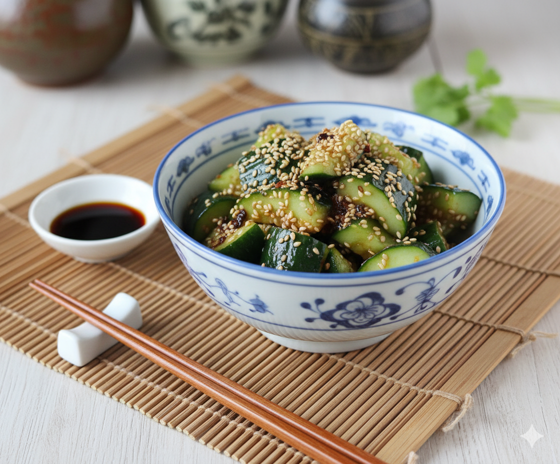 Efter agurkerne har trukket i 15 minutter hælder du vandet fra i en si, og hælder dem i en plastikpose sammen med dressingen, masser det hele godt sammen og lad det så ligge og trække i 5-10 minutter inden det hele hældes op i en dyb tallerken, drysses med sesamfrø og serveres..