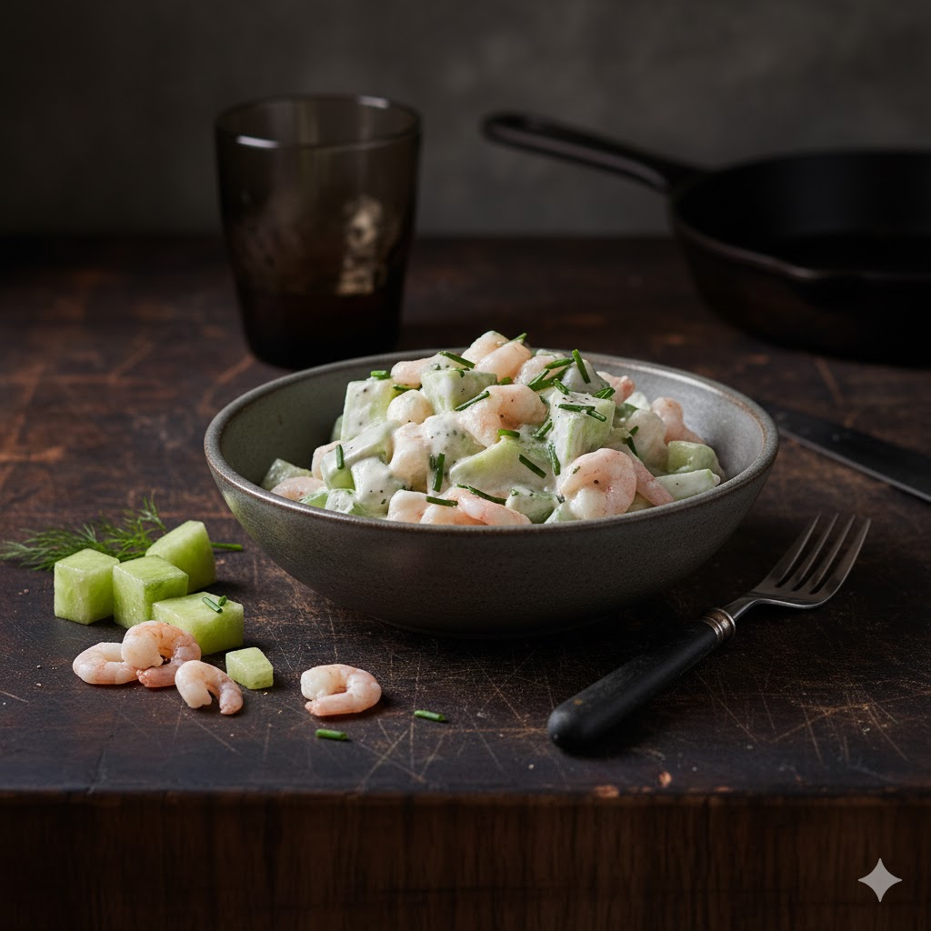Snit 4-5 stængler purløg fint og rør det ud i dressingen, kom nu dressingen, avocado-stumperne og rejerne i en pose og ryst det hele godt sammen, servér i en skål og pynt med lidt groft hakket purløg.