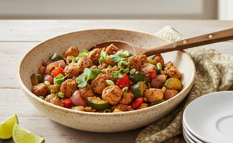 Steg baconen til den er gylden, hæld kylling og flæskesteg og løg i. Smag til med salt peber og engelsk sovs. Lad det simre i et par minutter før du tilsætter aubergine og couargetter (vi begik den fejl at hælde det i for tidligt så de blev alt alt for bløde … men det smagte stadig skønt).