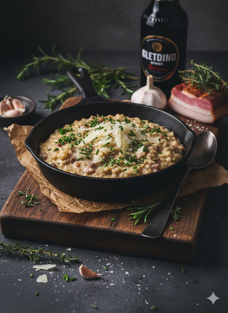 En smagsfyldt umami bombe af en ret med en dejlig cremet konsistens som man kender den fra klassisk risotto, der faktisk er både nemmere og hurtigere at lave end den klassiske risotto, her i en variant med bacon tern der udgør en lækker sprød prik over i'et.