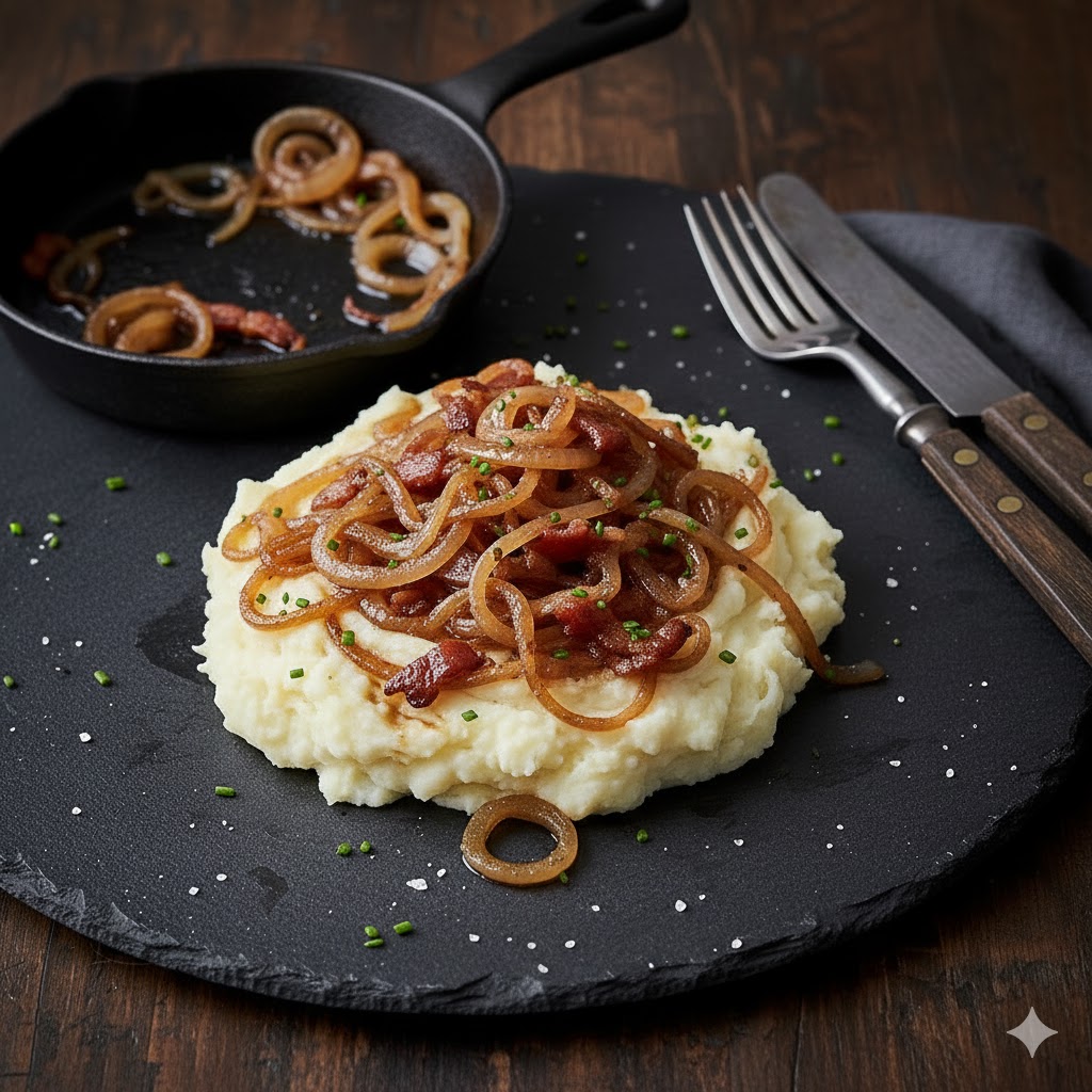 Anretning: Tag panden med de bløde løg af komfuret, og hæld den drænede bacon i og blandt det godt sammen. Kom en god klat mos på tallerkenen og top det af med en pæn portion kræs, spis det mens det er varmt.