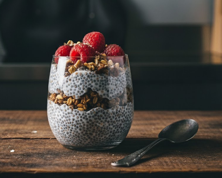 Kokosmælk, chiafrø og udskrab fra vaniliestangen røres sammen og sættes på køl, omrøres efter cirka en time og er herefter på køl til næste morgen, dog max 2-3 dage.