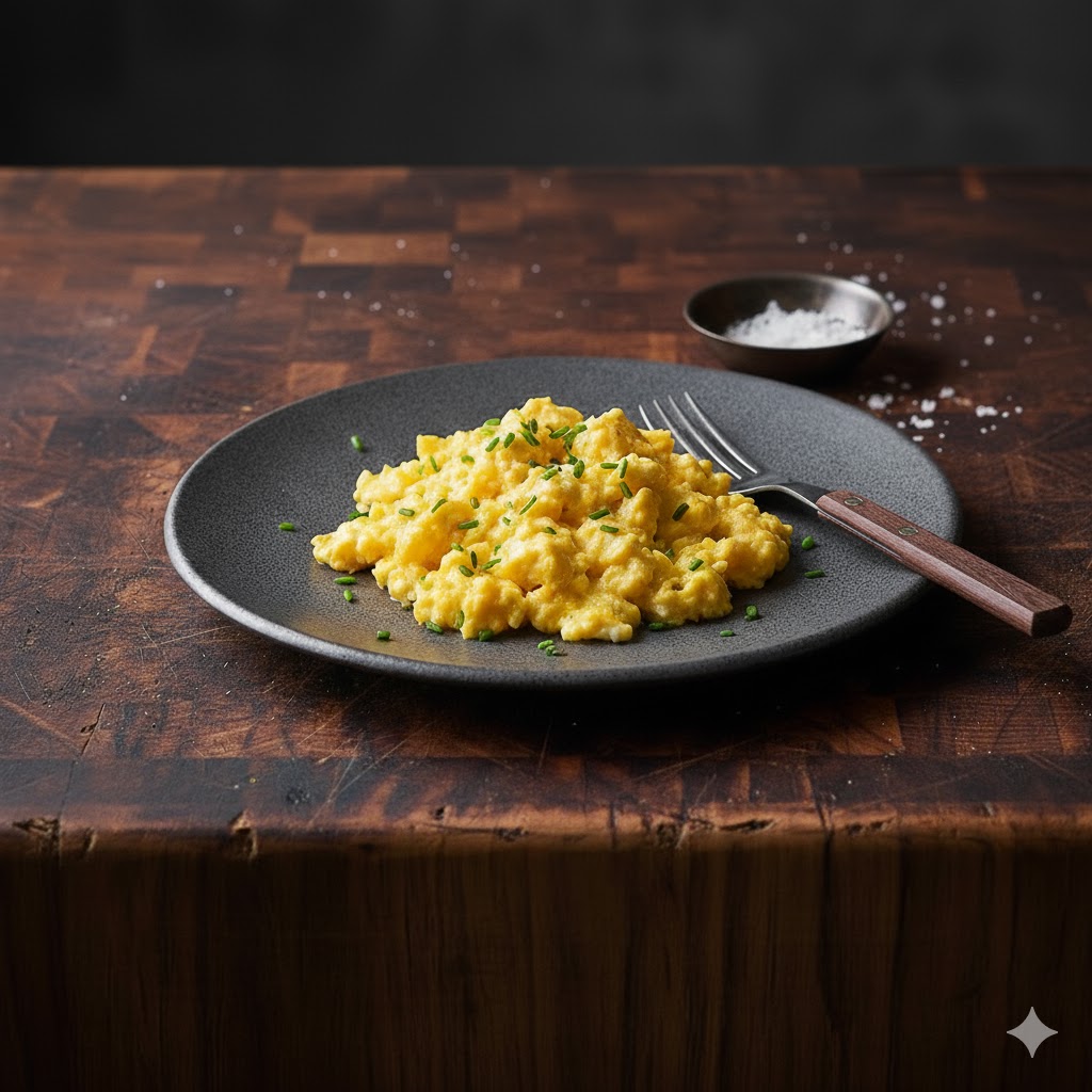 Slå alle æg ud i en skål og bland dem godt sammen med en gaffel, æggemassen skal være helt uniform. Tilsæt så cirka 25ml fløde pr. æg, dvs. her skal bruges 100ml. Sæt en pande på lav til middelvarme og smelt en meget lille klat smør i den, smøret må ikke syde, når smøret er smeltet helt hælder du æggemassen i og rører konstant til den begynder at få en konsistens som meget blød røræg.