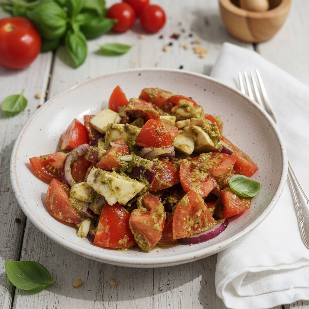 Spred tomatter, mozeralla og salat på en bradepande, og spray et flot lag olivenolie og tilsæt salt, peber og hvidløgspulver efter smag – fordel pestoen udover bradepanden, og rør det forsigtigt rundt med en stor grydeske, smag på det og tilsæt yderligere olivenolie og/eller kryderier efter behov.